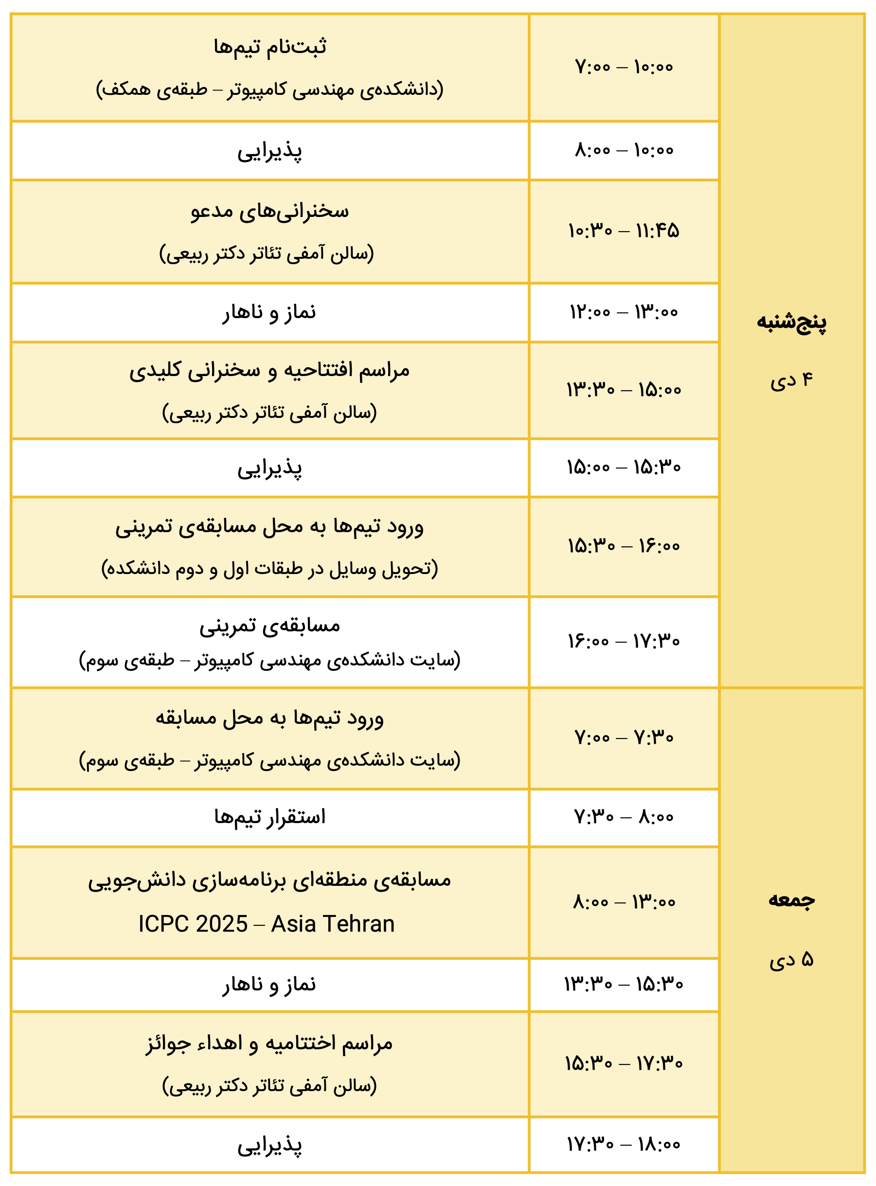 به وبلاگ رسمی مسابقهی بینالمللی برنامهسازی دانشجویی (ICPC) در تهران خوش آمدید. بیست و ششمین مسابقهی منطقهای تهران روزهای ۴ و ۵ دیماه ۱۴۰۴ به میزبانی دانشگاه صنعتی شریف برگزار میشود.
