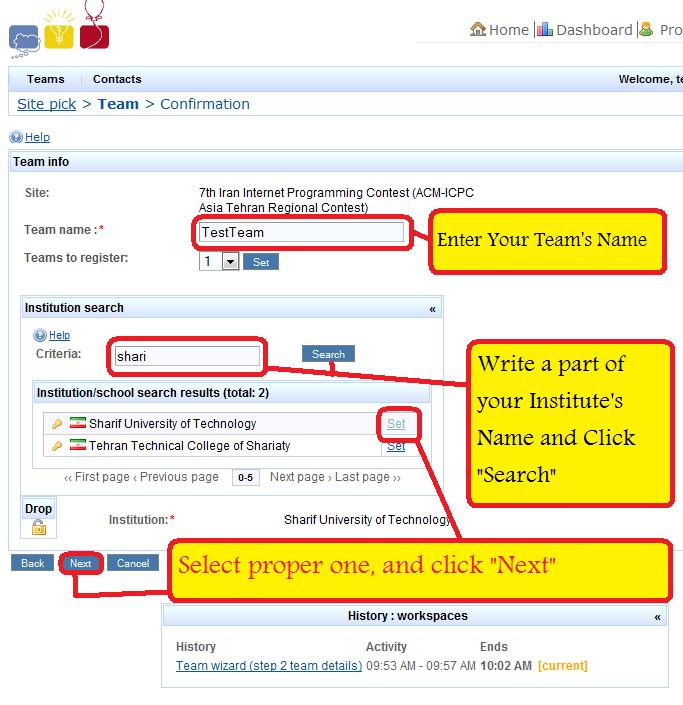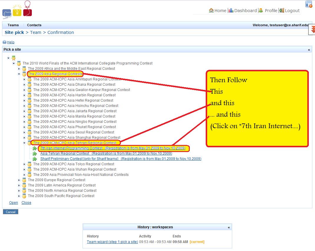 توصیه میکنیم تیمهای علاقهمند به شرکت در مسابقه، تا قبل از پایان دوشنبه، اطلاعات و بهخصوص آدرس ایمیل اعضای خود را نیز در سایت baylor وارد کنند تا در صورت دردسترس نبودن مربی تیم، از دانستن نام کاربری و رمز عبور خود بیبهره نشوند.